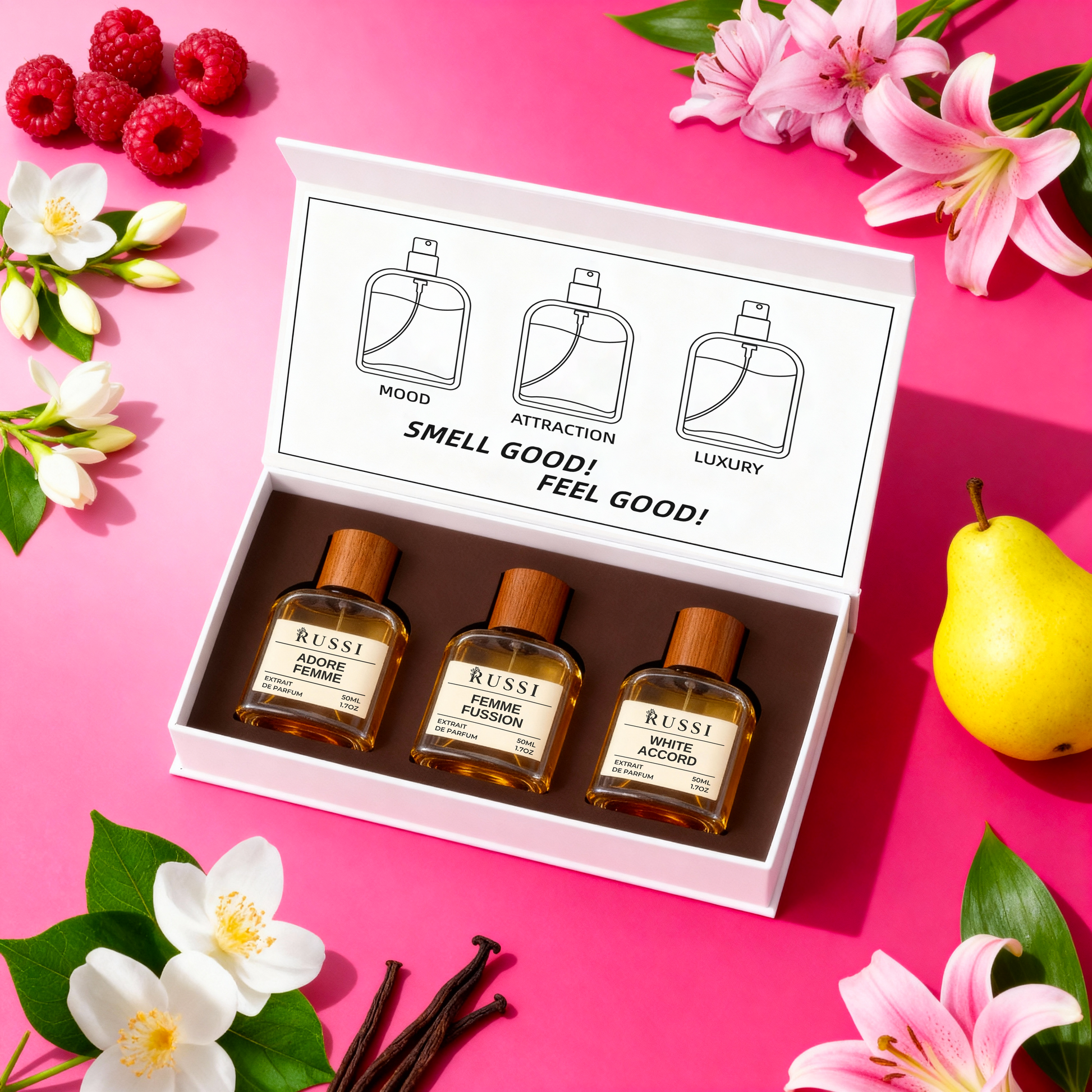 Uzdrīkstošs, vilinošs un kontrastējošs aromāts, kurā saplūst maigas ziedu ar saldiem un austrumnieciskiem akcentiem. Komplektā tas atspoguļo nakts noslēpumu un sievietes spēku.